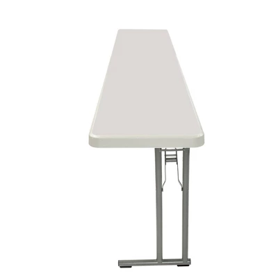 The BT1800 Series blow-molded seminar folding tables are ideal for, but not limited to, training and conference room use. Conveniently lightweight and transportable. The plastic light speckled gray tabletop is scratch-resistant yet still enables a surface smooth enough for writing, heat-resistant up to 212º F and a weight capacity of 700 lbs. The textured gray powder-coated 16-gauge steel frame features leg braces with spring-loaded push-button closing capability for maximal ease and stability. Best of all, the cantilevered legs offer ample and comfy leg room to prevent the user from banging their knees!