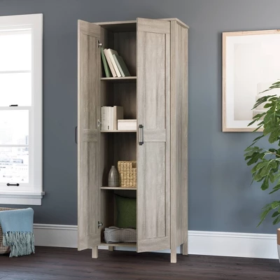 Running out of room and can’t hide all your stuff? Well, we have just the solution for you! Add versatile storage and a warm look to your home dรฉcor with this two door storage cabinet from the Sauder Select collection. Behind this storage cabinet’s two large doors is a spacious hidden storage area with three shelves for you to store anything from spare blankets and stacks of towels to board games and your collection of novels. You can find room for it all! This double door storage cabinet includes two shelves that feature the ability to move to different heights to create flexible storage options for items of all shapes and sizes. The charming style and simplistic design of this storage cabinet with doors make it a great addition to any room in your home โ in the living room, down the hallway, in the entryway or even in your bathroom! Finished in Spring Mapleโข and detailed with attractive hardware, this classic looking living room storage furniture will have you feeling organized in no time!
