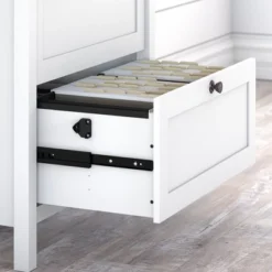 Keep important paperwork organized and accessible with file storage that suits your casual home. Highlighted by its relaxed modern farmhouse style, the Bush Furniture Mayfield 2 Drawer Lateral File Cabinet makes a great addition to virtually any living space. Two drawers open on smooth full-extension ball bearing slides for an effortless reach to your legal, letter and A4-size documents. Matching height dimensions allow the 31W x 20D x 30H lateral filing cabinet to offer an extended work surface when placed next to any Mayfield Computer Desk, and a Tall Hutch Organizer can be attached to create an open storage area for books, decorations and more (coordinating items sold separately). The sturdy and attractive post leg design promises to withstand years of use in your home office or living room. Dark Bronze drawer pulls complement a stylish Pure White and Shiplap Gray two-tone finish for an easy going appearance you’re sure to love. This 2 Drawer File Cabinet is tested to meet ANSI/SOHO quality standards for safety and performance and is backed by the Bush Furniture 1 Year Manufacturer’s Warranty. See the full collection for coordinating items available.