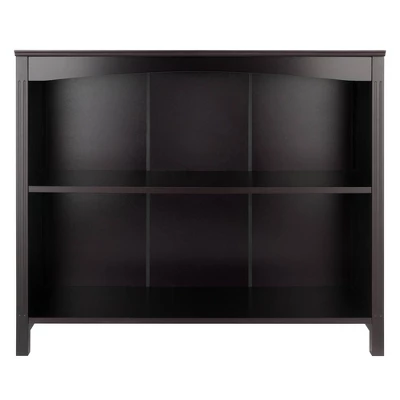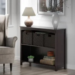 Enhance the appearance of any room with the simple yet attractive design of the Winsome Wood Terrace 4-Piece Storage Shelf Set. Spacious shelf perfect as a standalone bookcase in the home office or displaying family portraits and treasures in the living room. Finished in a rich espresso and made of solid and composite wood for long-lasting durability. The set of baskets are woven in durable flat polypropylene in a chocolate finish and have two cut out handles, one on each end, for carrying purposes. Prompt up and these baskets measure 10.24โW x 11.02โD bringing charm and style. When not in use, they fold for easy storage taking up almost no space. This set is shipped in two boxes. The shelf will ship separately and will include the hardware necessary for assembly.