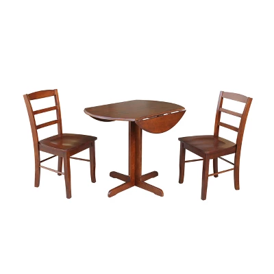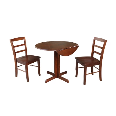 Whether it’s your weekend brunches or everyday meals, this 3-piece Dual Drop-Leaf Dining Table with Two Ladder Back Chairs from International Concepts make a perfect update to your family meals. Perfect for setting in a small dining room or a corner of the kitchen, this compact three-piece dining set creates a cozy spot for your casual meals. The comfortable matching chairs feature a ladderback design, while the round drop-leaf dining table provides plenty of space to place your favorite dishes while entertaining or everyday dining.
