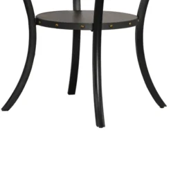 A bold statement for class and comfort, this 36 inch bar table features a smooth, black, rounded wood top and an open bottom shelf for simple and classically integrated storage. Rivets accent the glossy, smooth exterior and flared legs with a strong, industrial accent. Chairs sold separately. It is accented with metallic rivets.