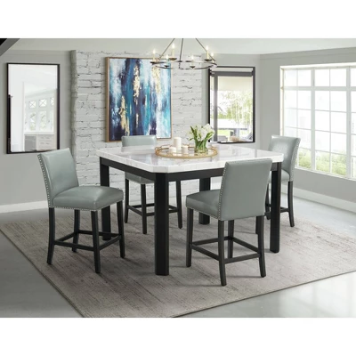 The Picket House Furnishings Celine 5PC Square Counter Dining Set is the perfect addition to your dining room. This set includes a counter height table and four counter height side chairs. The square table top features elegant, natural white marble which is a dining table classic. The chic, black finish of the table base is a perfect pairing with the marble top. For seating, two fully upholstered counter side chairs, with a low chair back accommodate this set. Faux leather beautifully wraps both chairs and is simple to clean. Polished, chrome nail head trim lines the outer edges of each chair for a chic flair. Order this amazing set for your dining room today!