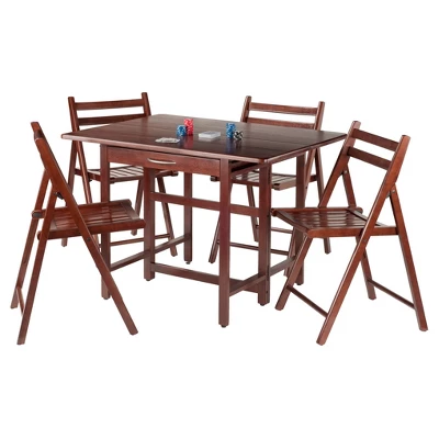 The Taylor 5-Piece Drop-Leaf Table with Folding Chairs Set from Winsome is a versatile addition to your home, whether for casual weeknight dinners or special holiday celebrations. Crafted from sturdy wood, the dining table set features a drop-leaf table and four folding chairs, all in a beautiful walnut finish. The chairs showcase a slatted design and conveniently fold up to open up your space when not in use, while the dining table with drop leaf can be extended in size to accommodate more guests. Plus, the drawer underneath comes in handy for stashing silverware, placemats and more.