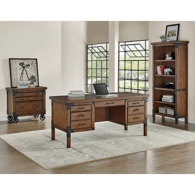 The Addison collection is inspired by antique, industrial tool boxes. Its dry Auburn finish highlights the natural beauty of the open grain veneers. Heavy iron casters with optional lock add function to the design. Black iron corner brackets and strapping add an element of authenticity, while light distressing enhances the aged appearance.