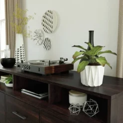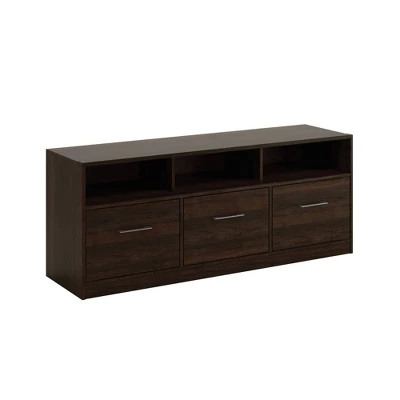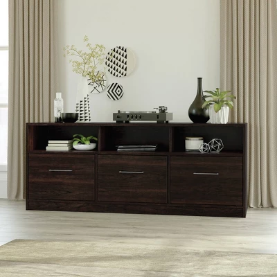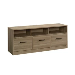 Every TV needs the perfect TV credenza to call home. Give your living room the style you love with the functionality you need with this cubby TV stand from the Beginningsยฎ collection. This TV stand with storage accommodates up to a 60″ TV, making it a great spot to binge watch your favorite show, have all-day movie marathons, or play endless hours of video games with your friends. The three large cubbies offer space to store and display items like your audio or video equipment, knick-knacks, books, and decorative plants. This media stand also features two hidden storage areas behind the outside doors. The center drawer opens and closes on smooth metal runners for convenient storage of other miscellaneous items. Plus, the enclosed back panel includes cord access to keep wires neat and out of sight. Finished in Summer Oakโข and detailed with attractive hardware, this entertainment credenza is everything you want and more.