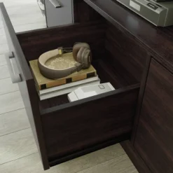 - Center drawer features metal runners and safety stops.