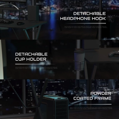 Gaming Setup: Reclining Chair with Lumbar Support & Headrest; Desk with Detachable Headphone Hook/Cupholder & Monitor Stand Additional Features: Gaming Desk, Powder Coated X-Shaped Frame, Detachable Cupholder/Headphone Hook, Removable Smartphone/Monitor Stand