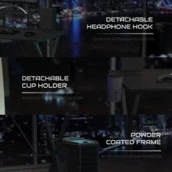 Gaming Desk & Chair Set – Reclining Gaming Chair with Slide-Out Footrest & Gaming Desk with Cupholder/Headphone Hook Additional Features: X-Shaped Powder Coated Frame, Detachable Cupholder/Headphone Hook, Cable Management Grommet