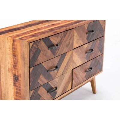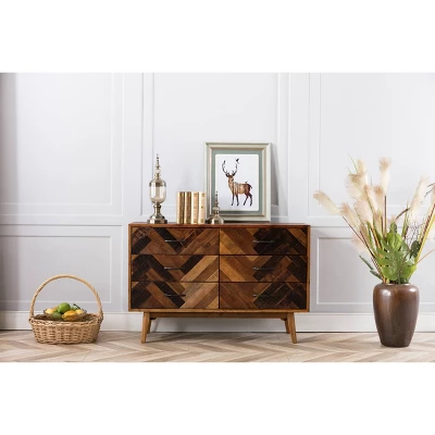 The Benton Dresser from Burnham Home brings your bedroom mid-century design reimagined for the modern age. Its oak wood body uses a mix of dark and natural stains, creating a rich array of tones. The inlaid chevron pattern on the front is eye-catching. Four angled legs flare outward for an additional mid-mod touch. Six drawers provide plenty of room for storing all your sweaters, trousers, t-shirts, and other clothing. Or get creative and use this piece as a credenza in a dining room instead. However you use it, be sure to pair it with the matching Benton Nightstand!