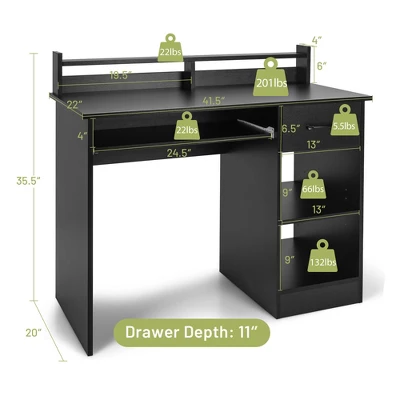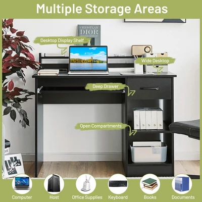 - Store-Friendly Design: With a 41.5” x 22” desktop, the writing desk offers free working space. It is designed with a pull-out keyboard tray for more convenience. There is also a long display shelf for daily necessities, a large drawer for private items and a 5-position adjustable shelf to accommodate different office supplies.