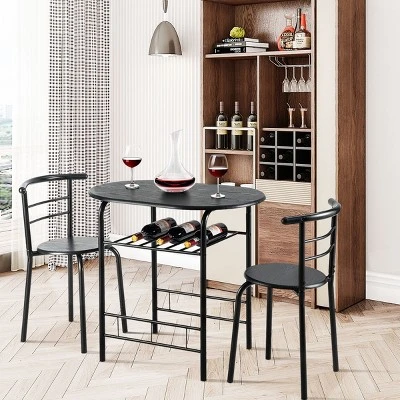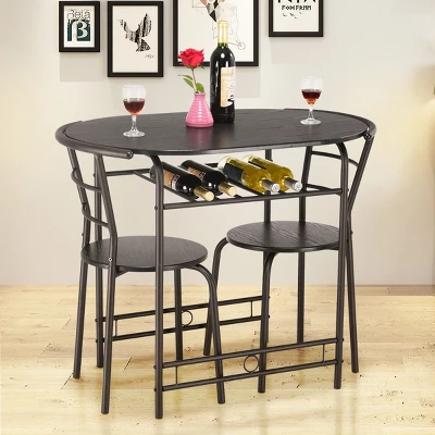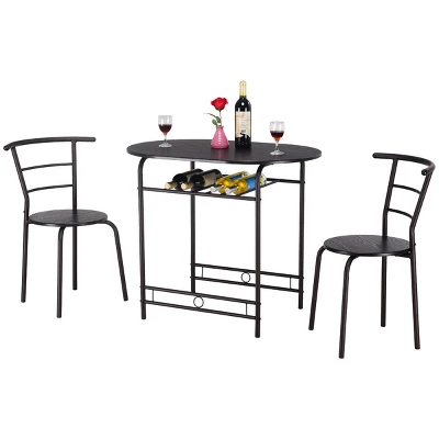 This is our new 3-piece compact dining set which adds a fashion style to your kitchen or dining room with our stylish. It includes a sturdy oval table and 2 armless chairs. With premium MDF and premium steel construction, this set is sturdy and durable, lasting for years to come. The table also features a wine rack under the desktop, keeping your favorite wine close at hand. It is easy to clean. You can enjoy meals, drink with this set and have a good leisure time.