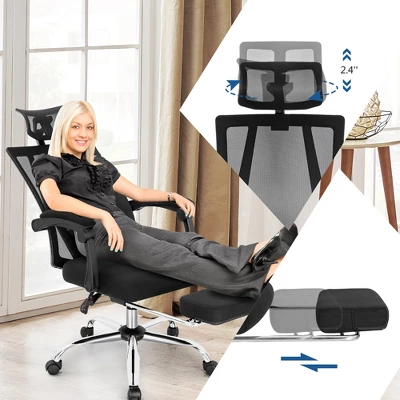 The inclination of the backrest(90°-135°) lets you adjust it to suit your different needs. You can adjust the seat to your desired height for a comfortable position. More, there is a retractable footrest, which helps rest your tired feet.The2D headrest with height and angle adjustable design can extremely relax your stiff neck. Plus, mesh backrest keeps air circulation and ergonomic lumbar support supports your waist for a comfortable sitting experience. The wide padded seat lets you stay away from the numbness in the long working day. Heavy-duty base and superior gas lift make it more stable and safe for long-service life. Thanks to the flexible casters and 360°swivel seat, you can easily move around and get higher relaxation.