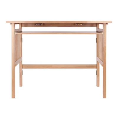 Increase the work space in your home office with this handy folding desk. It has a sliding keyboard tray for comfortable computer work. Its hardwood frame is sturdy and durable. with metal hardware and a stained wood finish, this folding desk fits right in with your home office dรฉcor. It’s compact size is ideal for small spaces. Folds easily for storage. 50 lbs. capacity. When fully expanded, the desk has an overall dimension of 40″W x 20″D x 30″H and when folded is 40″W x 3.4″D x 33.3″H . The table features a pull-out keyboard tray which measures 33.2″W x 13.75″D and has a 3.8″ clearance to the table top and has a clearance of 24.8″ to the floor.