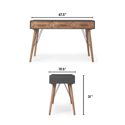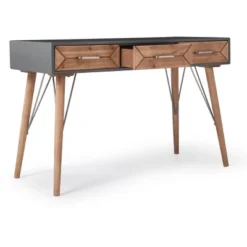 This high-quality desk console will add a sense of sophistication to your home office while also helping you keep your work organized. Three storage drawers make this the perfect versatile piece – whether you use it as a writing desk, entryway console, or chic vanity table. In a distinctive and contemporary style to complement your modern décor. A warm brown wood finish and sleek gray table top provide beauty and durability without overpowering your decor. The tapered wood legs of this piece finish off the look with a timeless sophistication.