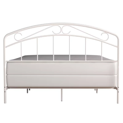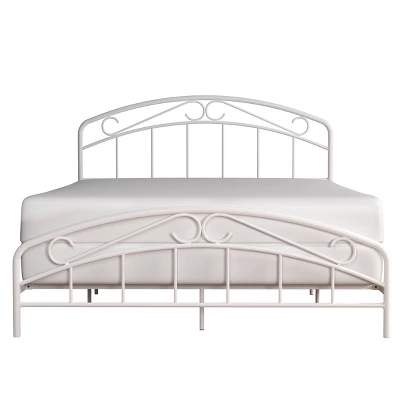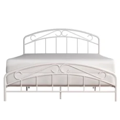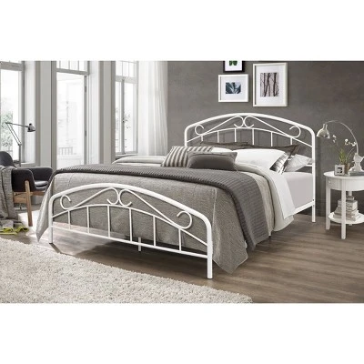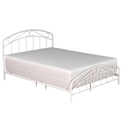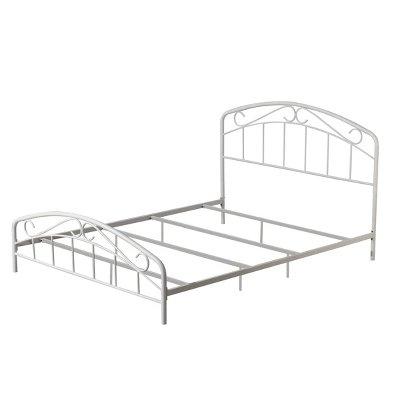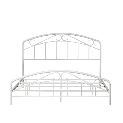 Boasting a casual design, this arched scroll metal full bed features a platform design with scroll detailing on the headboard and footboard. The combination of spindle bars and graceful scrollwork creates an aesthetic thatโs ideal in lodge and country cottage dรฉcor schemes. Finished in white to blend nicely with most color palettes. This full-size bed set includes everything you need to update your bedroom style in one box: headboard, footboard, and metal slat support system. Mattress and box spring required; not included. Assembly required.