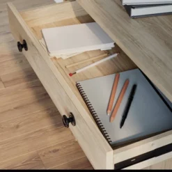 - Storage drawer features full extension slides for pens, pencils or spare paper.