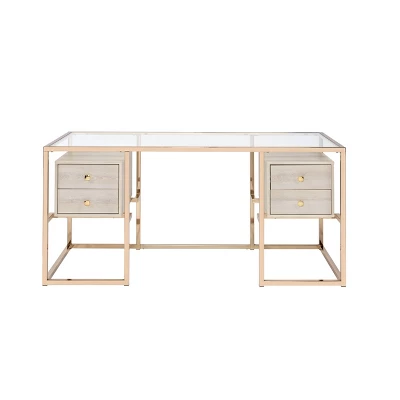 Add a touch of classic but modern flair to your home office with this Huyana desk. Inspired by 21st century contemporary design, the desktop is founded on transparent 8mm tempered glass for a floating effect. Two drawers on each side provides ideal places to store office supplies. With the metal sled frame finished in gold color, this piece will effortlessly elevate the room with sophistication.