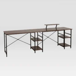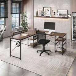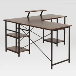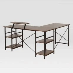 This industrial-style L-shaped computer desk retains the functional performance of modern furniture. It can be assembled in L-shape orย straight in-line shape to meet your space needs and comfort. ย Crafted from engineered wood, the ample storage and spacious workspace adds functionality and versatility. The walnut surface veneer textured matches the industrial black metal frame as it defines a characteristic simplistic touch . The desk frame is made of heavy-duty black powder-coated steel, ensuring maximum stability and durability. Color: Walnut. Dimensions: 59″W x 59″D x 35.3″H