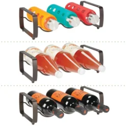 Organize and show off your wine collection with the Countertop Wine Rack Organizer by mDesign. Each rack holds up to 3 bottles of your favorite wine or bottled drink. The stackable design lets you create vertical, space-saving storage on kitchen counters for instant access or in the fridge for perfectly chilled drinks. Curved compartments keep each bottle separate and organized, while the open tops make it easy to grab a bottle right when you need it. Each wine rack features decorative balled feet that elevate stored items from tabletop and counter surfaces to keep them dust free. The feet also nest inside each corner of other racks to help them stay firmly in place when stacked.