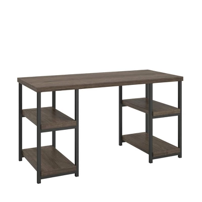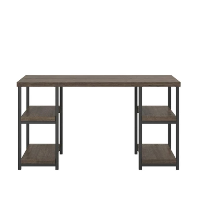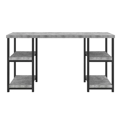 Your home office can now be functional and phenomenal thanks to this multi-functional desk from Room & Joy Meyers collection. Crafted in the double-pedestal style, this desk boasts a faux-concrete look made from specially laminated paper, making it easy to clean and simple to maneuver. The 4 open shelves are built to hold all your home-office needs, from a printer and scanner to paper, pens, agendas, and more. Just add accessories and make yourself at home! Sturdy black metal legs are made to support and distribute the load, so the Meyers desk is all you need to get your work done. This trendy piece is designed to be budget-friendly and requires some light assembly.