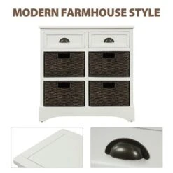 The combination of the distressed acacia wood with the wicker baskets gives this unit a modern farmhouse feel that would look great as a nightstand or a hallway unit. Featuring a acacia wood body, beautifully woven wicker baskets, and aluminum alloy drawer pulls, this piece is durable, stable, and strong. The hand-woven rattan frame feels smooth and moisture-proof.Two drawers and four classic rattan basket sit in an floating, bottomless shelf allowing for maximum storage space in each basket. This exquisite cabinet with rubber pads at the bottom is suitable for any space, making your space dust free.