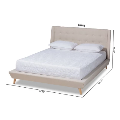 Bask in mid-century glory with the Naya bed. Built with a sturdy wood frame, the Naya is upholstered in a soft, foam filled polyester fabric that provides ample comfort for you to rest against. The wingback headboard displays button tufting for a touch of refinement and visual depth. Displaying the hallmarks of mid-century modern design, the Naya features a low platform elevated by oak finished angled legs. The Naya bed is made in Malaysia and requires assembly.