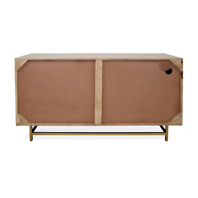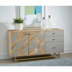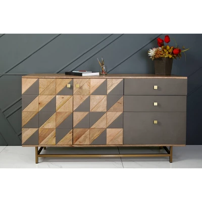 A visual delight. The two doors on his stunning Credenza have a quilted pieced together quality which combine the natural wood tones of our Diversion Natural and Cement gray into an intricate and eye-catching design. Three drawers go down the side continuing the color theme, and are accented by diamond shaped golden hardware to tie into the open metalwork base. A wonderful Credenza that will be a focal point for any decor.