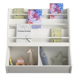 - The 2 open compartments can easily organize your childโs toys and games while the 3 shelves are perfect for their favorite books