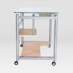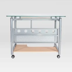 This Techni Mobili rolling computer desk is constructed from safety-tempered frosted glass in a steel frame with a scratch prevention finish. This contemporary furniture will hold your monitor, keyboard, printer and CPU. It includes easy-glide casters for easy positioning wherever you desire. The top is made of 10mm safety-tempered frosted glass that is strong enough to hold a computer monitor. The rolling computer desk has a perforated back panel to facilitate wires and cords, and keep them from view. The product can be easily assembled with the included mini-screwdriver and wrench. This contemporary computer desk is made of glass and silver-colored metal. Its steel frame has a lead-free powder-coated finish that prevents scratches. The panels and shelves are made of strong engineered wood with a PVC laminate that protects against moisture. The entire desk is on rolling casters that allow for easier movement to other areas of the room, so you can change your space to suit your needs. Product Dimension: 39.5”W x 23.75”D x 30”H