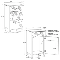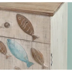 Unique coastal storage side table featuring a school of fish depicted in both carved 3D wood forms and hand painted versions. An overall ocean weathered, whitewash and natural look provide a found treasure feel. Features a slide out drawer for storing remotes or controllers. A door opens below to revel a large storage area. Arrives fully assembled and ready to add to your bedroom, kid’s room, living or family room. Ideal for a beach cottage or coastal themed room.