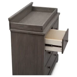 Impressive and substantial, the Paloma 4 Drawer Dresser with Changing Top from Simmons Kids instantly brings warmth to any space. Gorgeously made from strong and sturdy pine, this dresser features a hand-distressed, soft textured finish that makes each piece one of a kind. Built to accommodate your child’s needs, this rustic dresser features a removable changing topper, plus it has two large drawers and two smaller drawers to house all their clothes and accessories. Pair it with the Paloma 4-in-1 Crib (sold separately) to complete your nursery. Due to varying wood grains and variations in the hand-applied finish, product might appear slightly different than those shown on site.