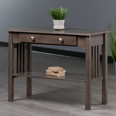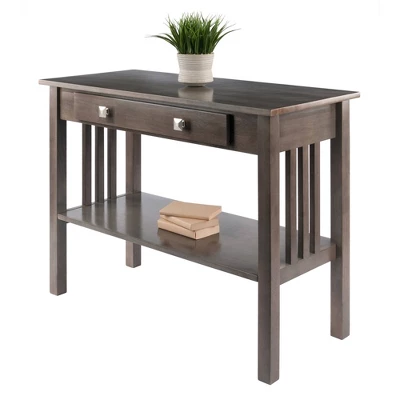 With clean line and contemporary oyster gray finish, the Winsome Wood Stafford Console Table makes a great complement to any decor. As an entryway table, it will welcome you home as a place to keep your keys and briefcase. Or use it in the dining room or living room to show off a lamp, favorite plant, or photos. The console’s open shelf and unit-wide drawer offer a wealth of storage options. The mission-style slatted side panels combined with the console’s straightforward, contemporary design allow for a seamless blend with any decor. Two beveled silver-finish drawer pulls provide the perfect accent. Coordinate this console table with other furnishings from the Winsome Stafford collection for a cohesive look throughout your home (each sold separately). Solid and composite wood construction for long-lasting integrity. Conveniently packed and shipped in 1 box, that includes the hardware necessary for assembling. Replacement part request can be submitted directly to the manufacturer within 60 days from date of purchase.