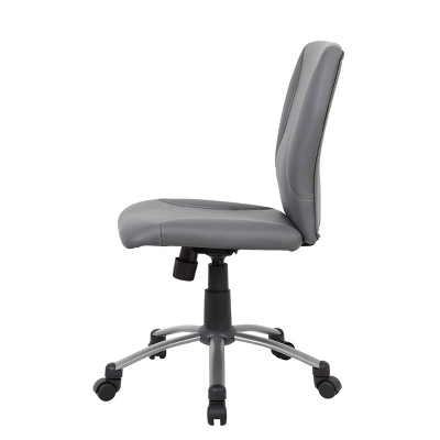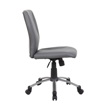 This Tiffany Task Chair is beautifully upholstered in gray CaressoftPlus with double stitching back and seat. It has an elegant and stable Pewter finished base. This contemporary task chair allows for upright locking positions, providing personalized back support for your individual needs. It also provides adjustable tilt tension control, allowing you to customize the optimal angle at which you sit. It has a pneumatic gas lift seat height adjustment, allowing for versatile adjustment of the seat height to suit your comfort and work environment. The hooded double wheel casters make it easy to move and shift directions.