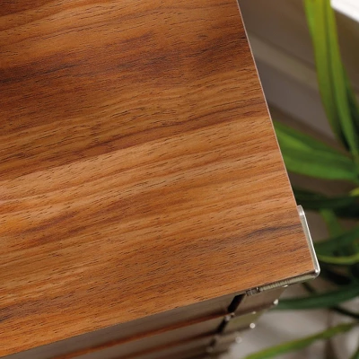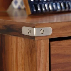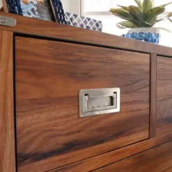 Is your bedroom getting a little short on storage space for all your clothes and accessories? We can fix that! Give your bedroom the additional storage space it needs without having to sacrifice on the style that you love with this 5-drawer chest from the Vista Key collection. This bedroom chest includes two small drawers and three large drawers that open and close on smooth metal runners. The large drawers are ideal for stowing away various different items like stacks of slacks and button up shirts or your collection of t-shirts and pajama pants. The two smaller drawers are perfect for storing undergarments, socks, and accessories. This dresser has room for all your things! Each drawer front is detailed with decorative hardware for an extra touch of style. The spacious top surface provides you with an additional place for items like framed photos, bottles of perfume and decorative plants. Finished in Blaze Acacia and accented with metal corner brackets, this stunning chest of drawers will have you feeling organized in no time.