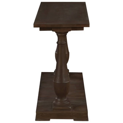 Perfect for a living room or entryway foyer, this transitional sofa table lends a charming traditional flair. A rich coffee brown finish offers a refined look to the tropical wood construction, creating a bold look against a focal wall. This sofa table also offers a spacious and long tabletop and open bottom shelf for resting accent lamps, baskets of throws and more. Connecting the plank style surfaces are column-like turned pedestal legs that offer a classical element. A tall and open space above the bottom shelf invites one to store taller decorative items too.