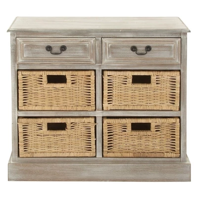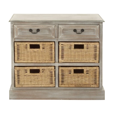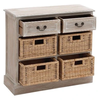 - โขStorage unit features cabinet with 2 drawers with pull handles and 4 shelves with woven rattan baskets