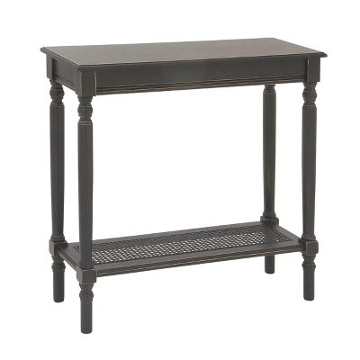 - •Black narrow console table features a flat top, bottom shelf with rattan inspired weaving and supported by four pillar style legs for a simple yet classic design