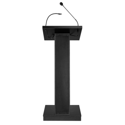 The ZED Lectern is a versatile, 40-watt sound lectern, suitable for medium-sized venues like conference rooms, meeting halls, auditoriums and cafeterias. It offers a spacious reading surface illuminated by an attractive halogen lamp. A surface-mounted digital timepiece is included for monitoring speech duration. The unit includes an attractive 21” gooseneck microphone with a factory-installed XLR mount and a tie-clip/lapel mic with 10′ cable. Our newley designed amplifier along with our digitally enhanced powerful speaker system made up of four 4” 40W speakers, allows for crystal clear presentation. This unit delivers a strong and robust sound using our provided wired microphones or with our optional wireless microphones. Its elegant cabinetry features a sleek Z-shaped design with speaker system encased in an aesthetically pleasing steel grill and is finished in a black laminate to complement any room décor. Multimedia capabilities include simultaneous usage with two wired and one wireless (optional) microphones. It operates either by AC plug or with optional battery model PS12-V and features input jacks for CD players, extension speakers, USB, Bluetooth, recording outputs and playing MP3s. The unit is equipped with four concealed easy-roll casters for easy mobility. Ships assembled.